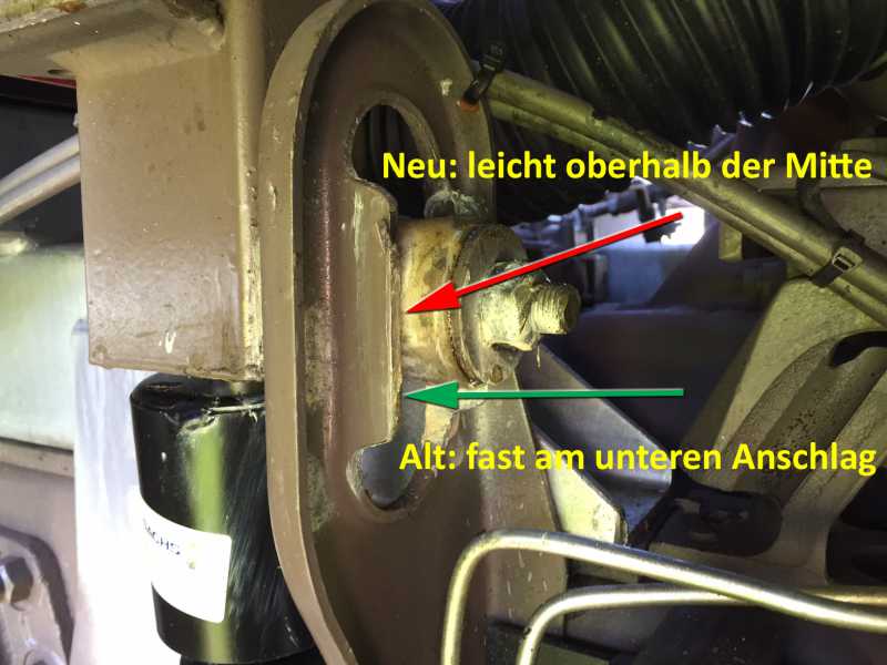 Weiter kann ich sagen, dass der untere Halter - ganz genial - zwei Löcher für die Befestigungsschrauben hat. Damit könnte man die Höhe nochmals um ca. 2cm raufsetzen. Wer also tonnenweise Material auf dem Dach hat, - das Fahrerhaus immer noch nach hinten neigt - , der könnte nach dem Dämpferwechsel nochmals erhöhen wenn nötig.