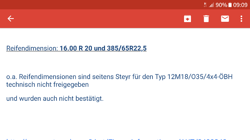 Reifendimension: 16.00 R 20 und 385/65R22,5. Diese Reifendimensionen sind seitens Steyr für den Typ 12M18/O35/4x4-ÖBH technisch nicht freigegeben...