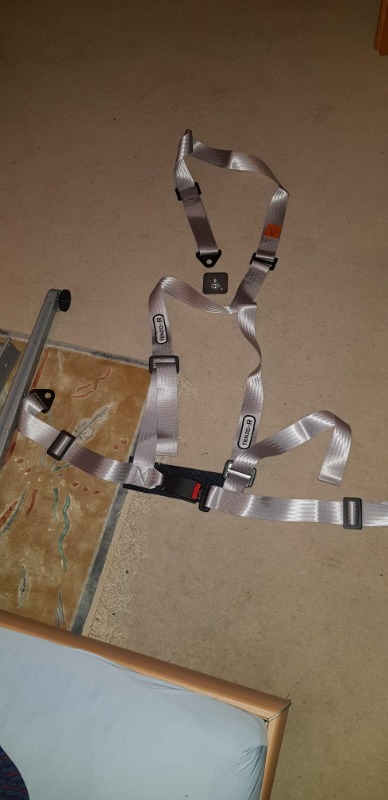 Verwende Flugzeugdreipunktgurte, welche an der serienmäßigen Sitzkonstruktion rechts und links mitbefestigt wurden (Bauchgurt) und für den einteiligen Schultergurt eine eigens hergestellte Schelle, welche an der hinter dem Sitz befindlichen Haltestange befestigt wurde.
