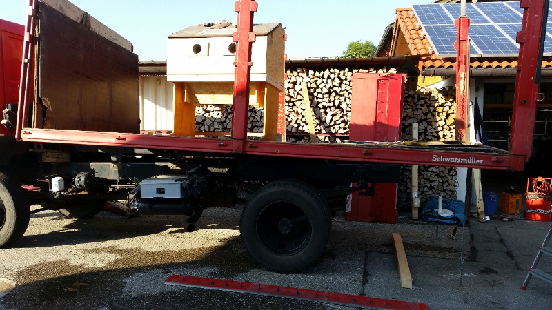 Hierbei habe ich nur einen ca 10cm Holzklotz am vorderen linken Rahmeneck (direkt hinterm Führerhaus) untergelegt.