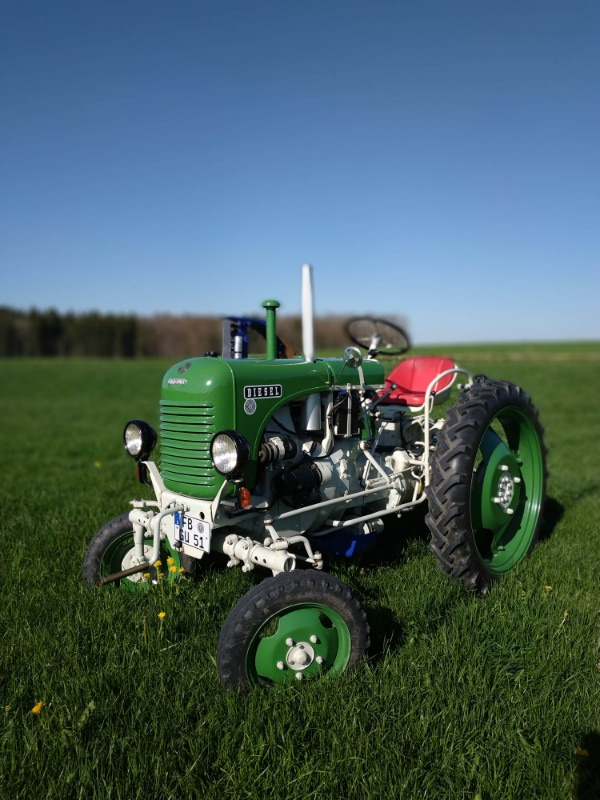 Der 15er wird nächstes Jahr 70. Er hat Vollausstattung. E-Starter, Hydraulik, Mähwerk. Alles da.