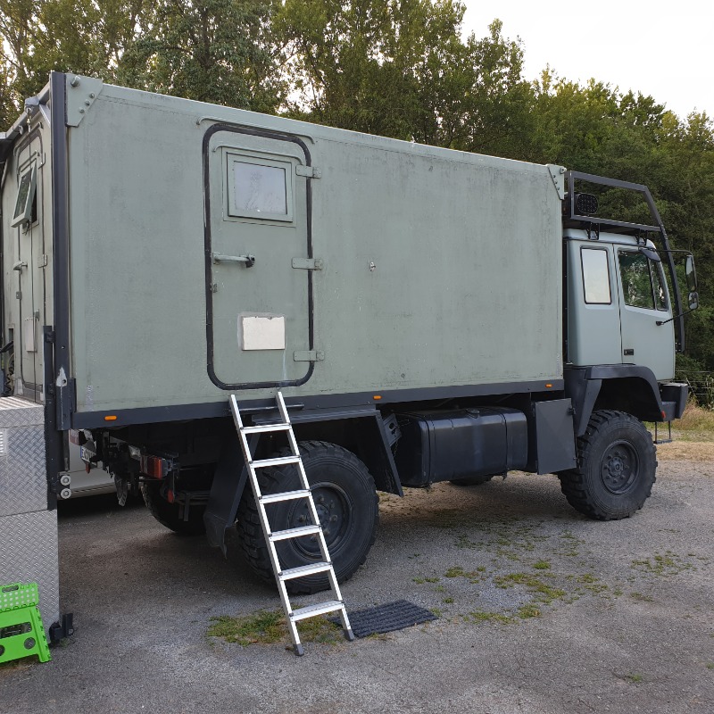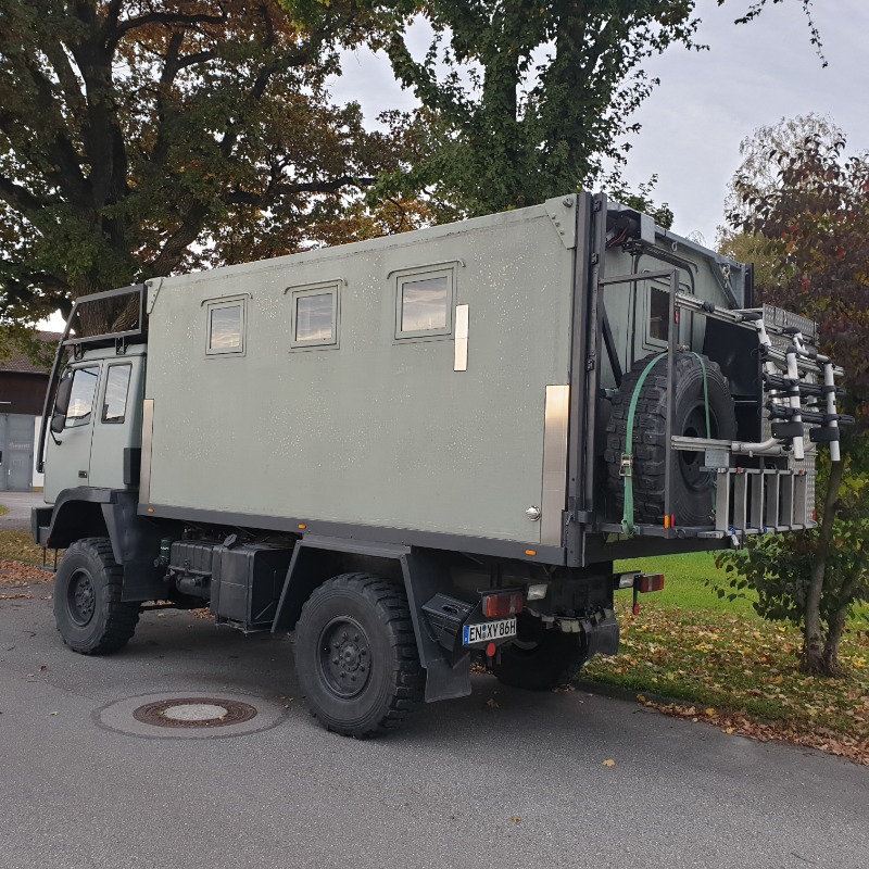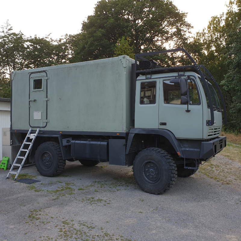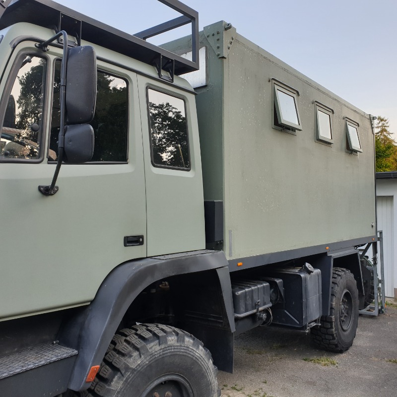 Die Arbeiten am Fahrgestell und der Heckträger sind von 4wheel24 gemacht worden. Neuer Lack Brantho Korrux 3in1 Ral 9011, großer Tank rechts mit ca. 400 Litern, Originaltank nach links, Abänderung des Auspuffs, Anpassung des original Zwischenrahmens an den Shelter.