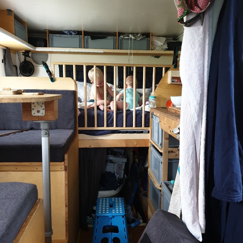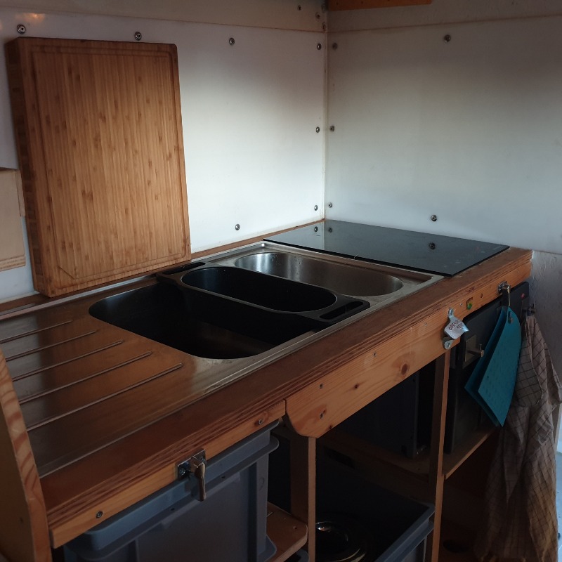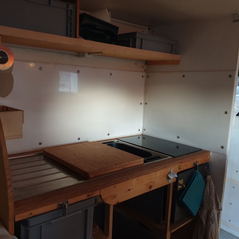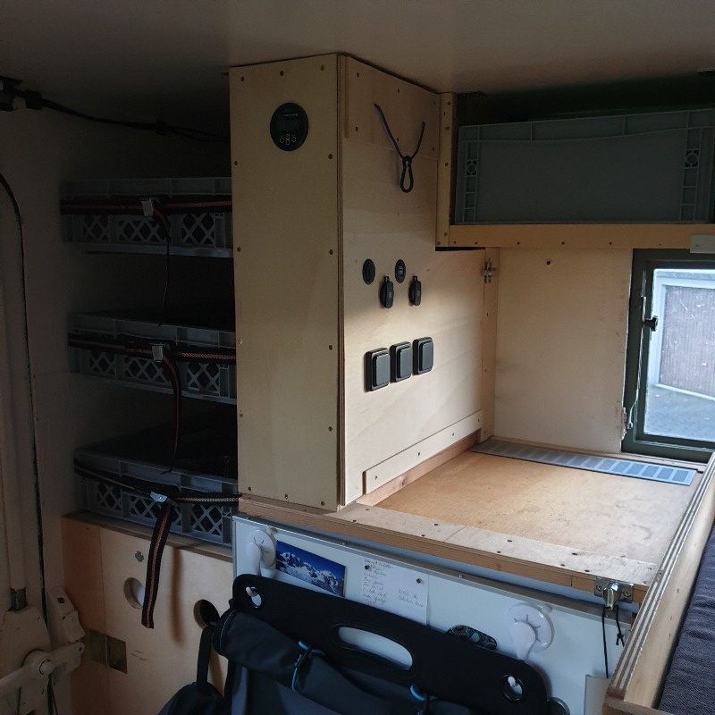 Der Wagen ist gasfrei. Gekocht wird auf Induktion. Dafür gibt es 440 Ah auf 24 Volt. Es sind Agm Batterien. Das Herz bildet eine Mastervolt Ultra 3500. Auf dem Dach sind vier Paneele mit je 150 Ah. Heizung ist eine Planar 44D Luftheizung. Wasser habe ich nicht mehr fertig gemacht. Geplant war Warmwasser über einen Elgena Luftboiler, wie bei Gilly.