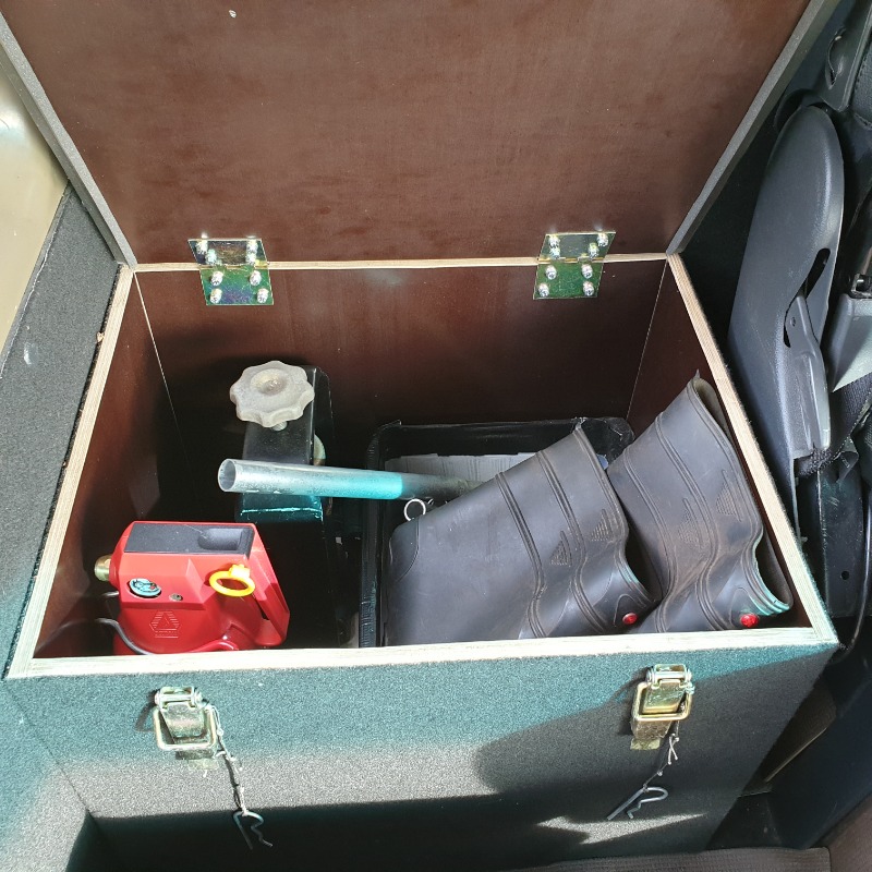 Hinter dem Beifahrersitz, ABF Feuerlöscher, Wagenheber, meine Gummistiefel, hinter dem Fahrersitz der Reifenfüller, Warndreieck, Westen und Warnlampe, plus Ersatzspiegel.