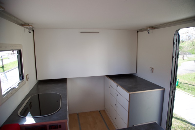 - Ausbau wurde weitgehend an Original C-Schienen befestigt und könnte entsprechend leicht modifiziert werden (die 2 untersten Schienen an den Seitenwänden sind noch vorhanden).