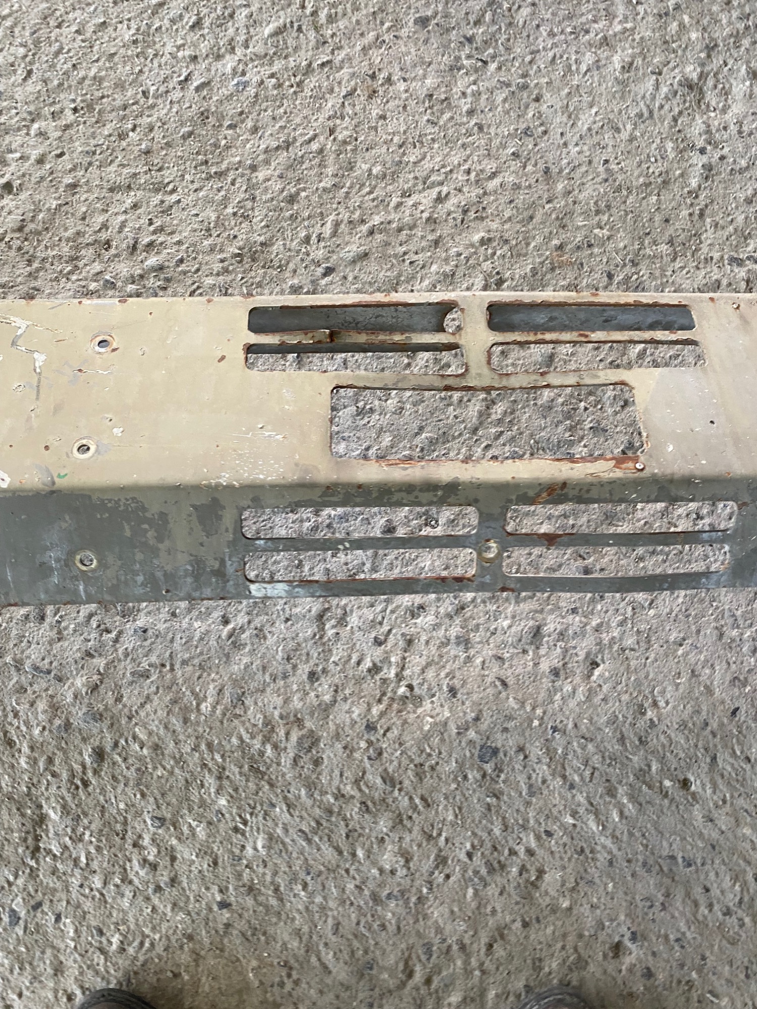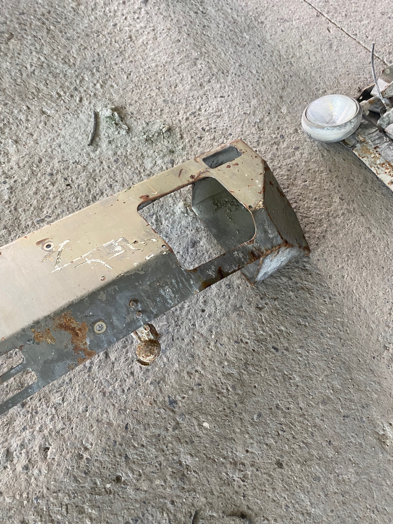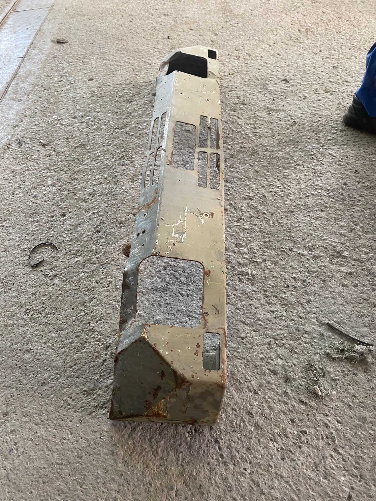 1 Stosstange Steyr 12M10 mit einem Unterfahrschutz. Die Stossstange muss natürlich überholt werden und ist stark gebraucht. Sie hat ein paar kleiner Beulen aber keine stärkeren Verzug. der Unterfahrschutz ist gerade und nicht verzogen.