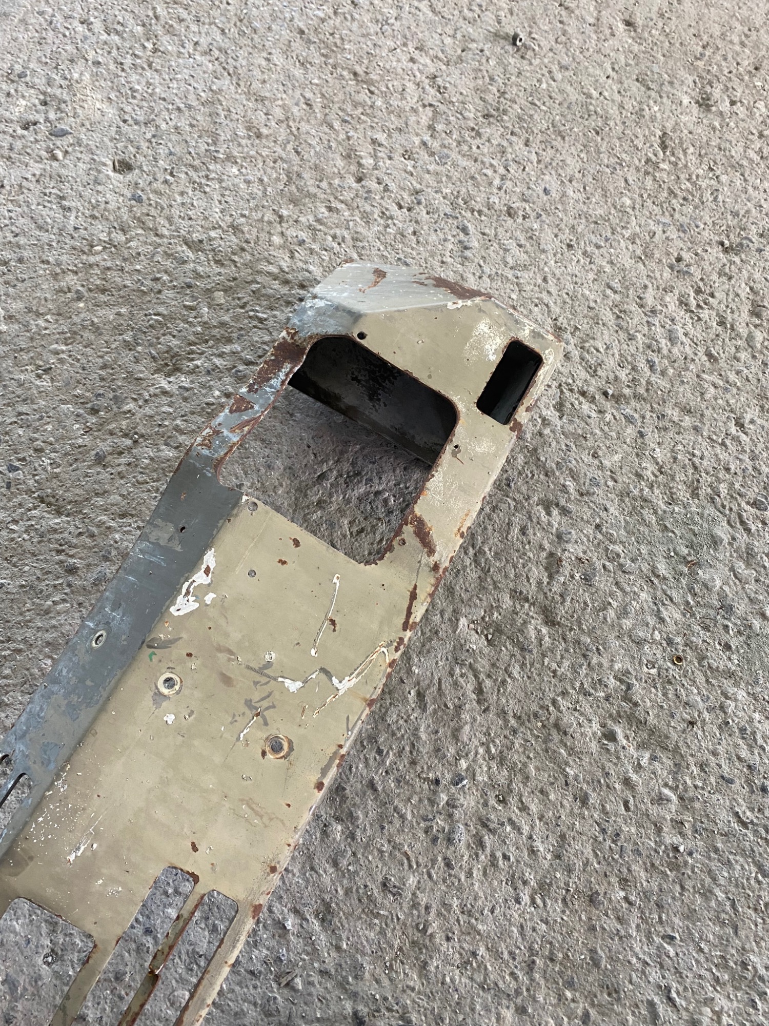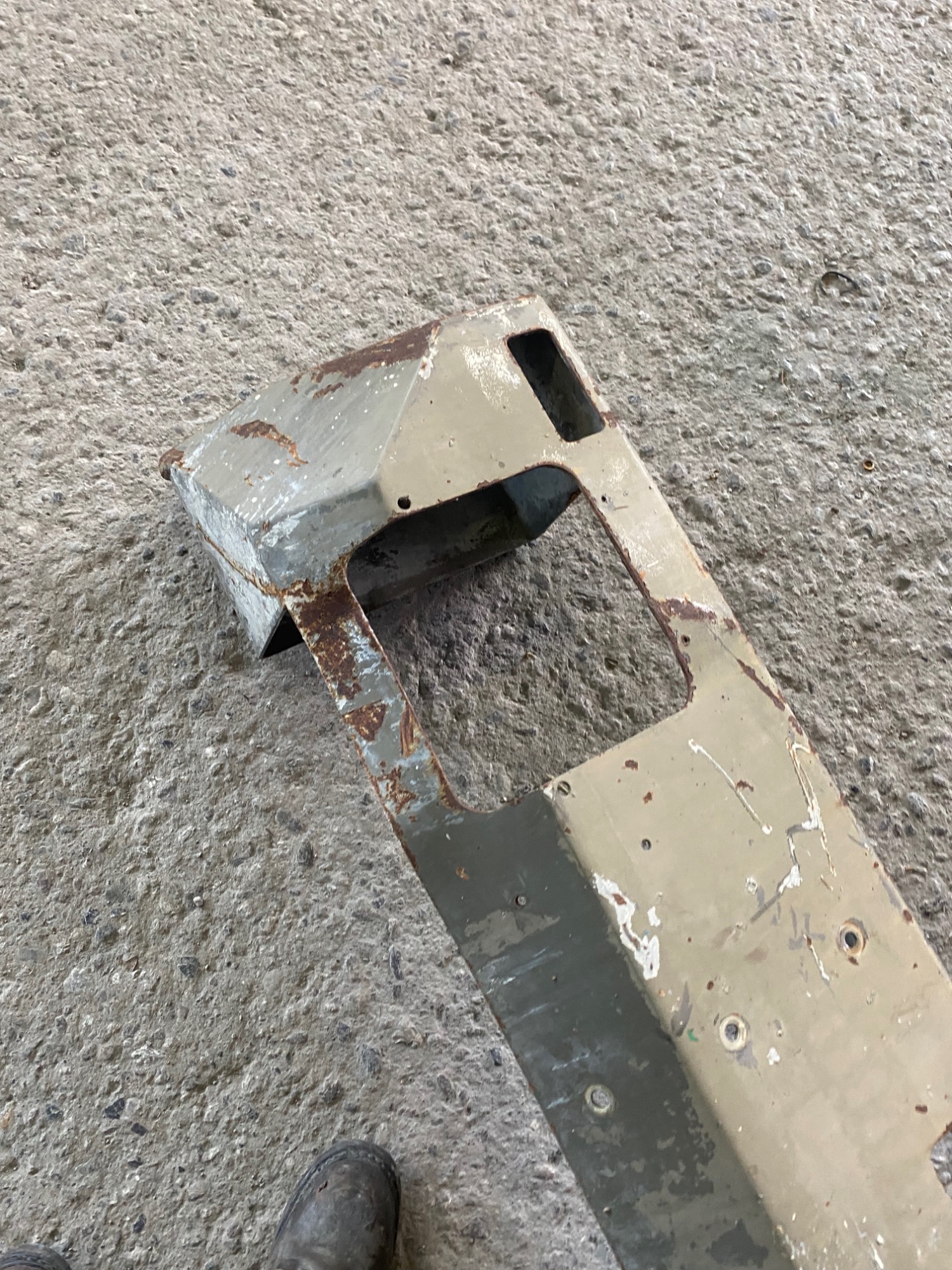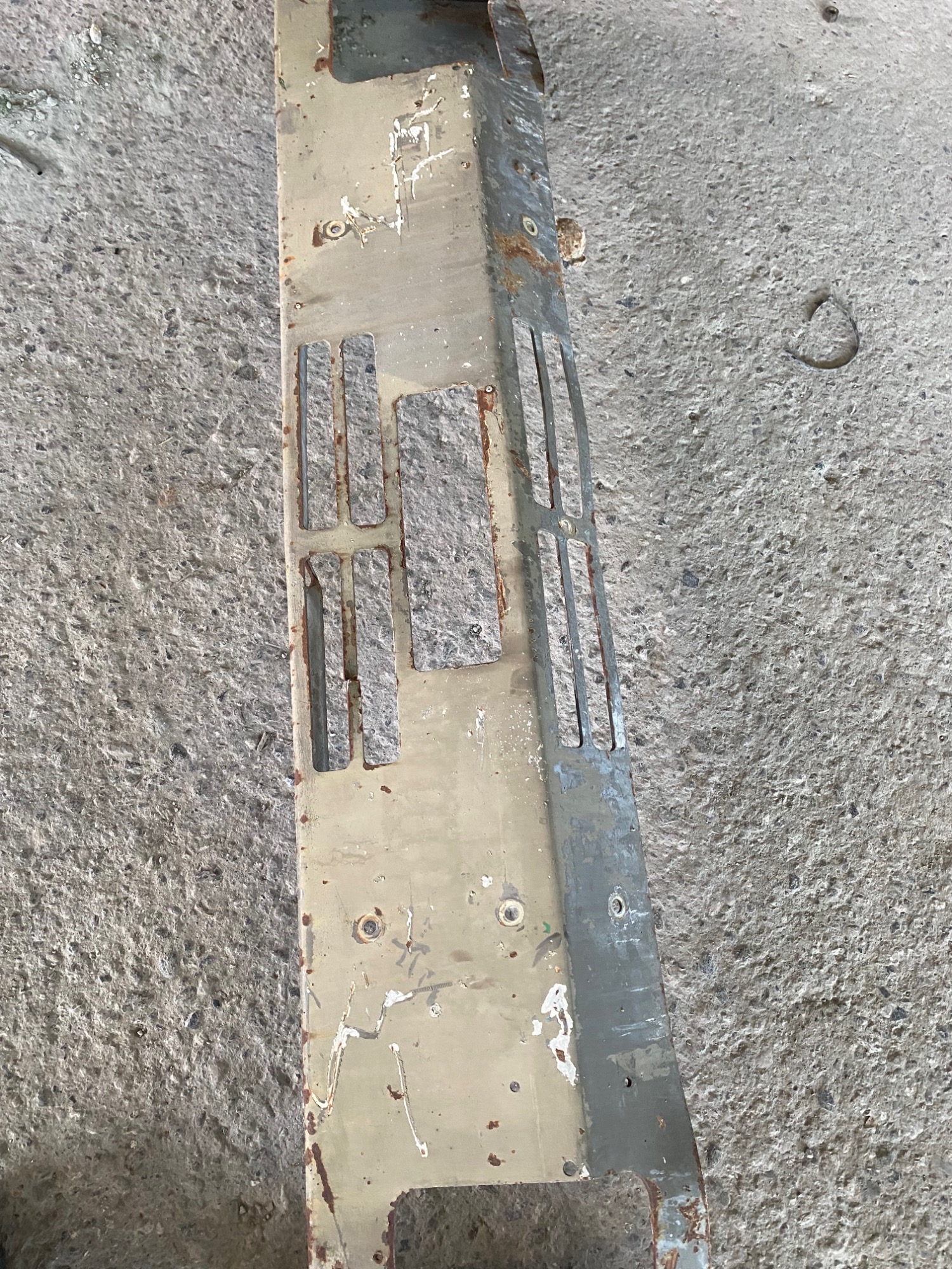 1 Stosstange Steyr 12M10 mit einem Unterfahrschutz. Die Stossstange muss natürlich überholt werden und ist stark gebraucht. Sie hat ein paar kleiner Beulen aber keine stärkeren Verzug. der Unterfahrschutz ist gerade und nicht verzogen.