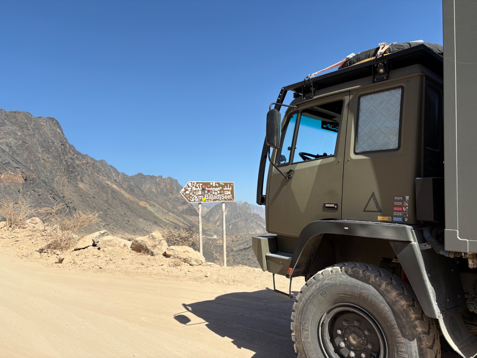 Die Piste ist gut gepflegt und meistens ziemlich breit und lies sich immer gut fahren. Kurz vor Bait Bima wurde es nochmal richtig steil und etwas enger, aber auch das lies sich gut fahren. Es geht am Anfang gleich steil bergab aber nichts was den Steyr überfordert. Mit Untersetzung im zweiten Gang und Motorbremse konnten alle Steilstücke gut gefahren werden.