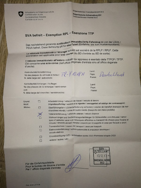 Tipp bitte hebe diese Bescheinigung auf. nicht jede Grenzstation kennt dieses Formular - die Basler aber schon.