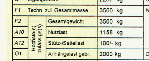 F1 sagt aus was die techn. zul. Gesamtmasse, besonders im Sinne einer Fahrzeugkombination (mit Anhänger), sein darf.