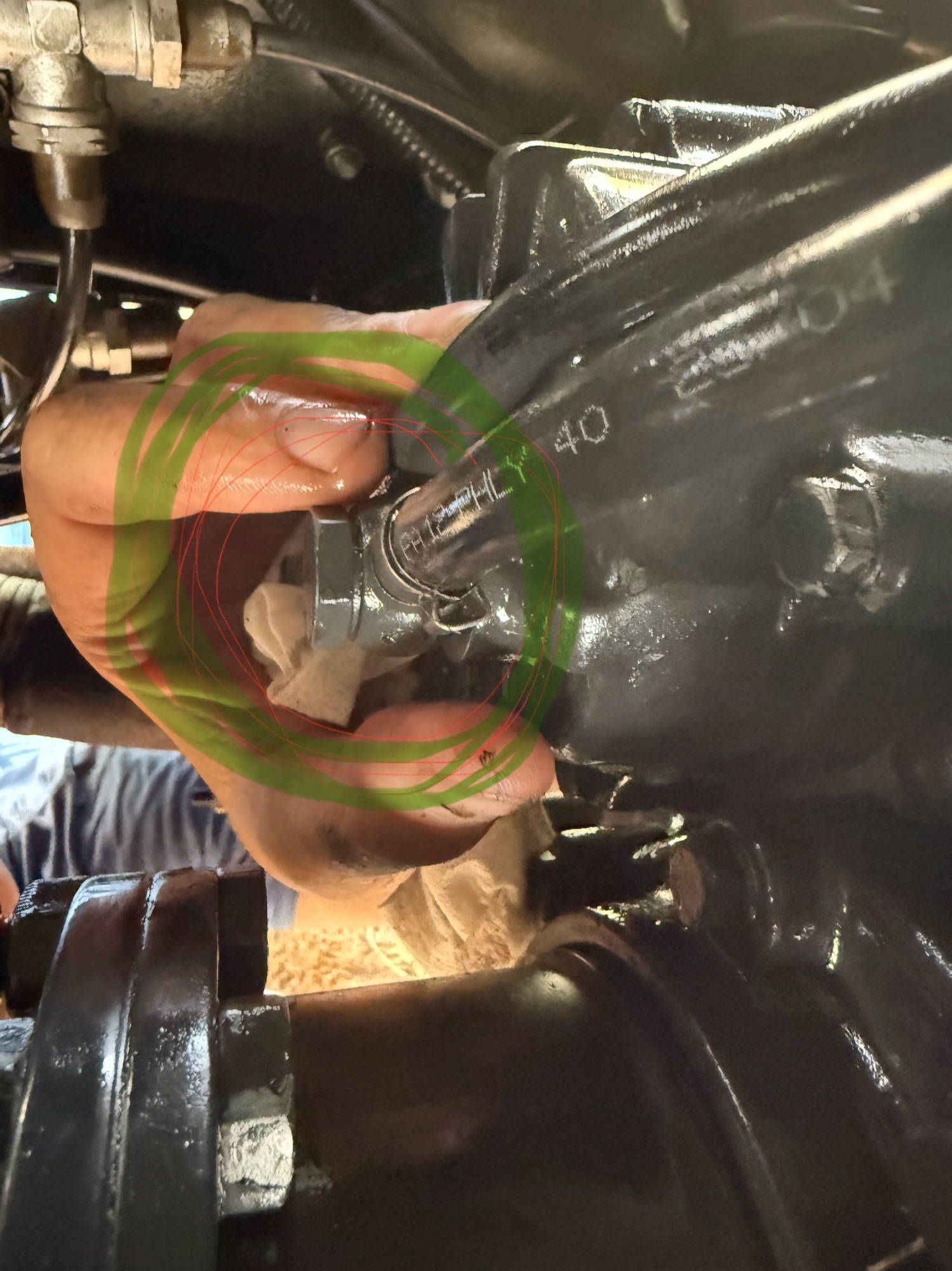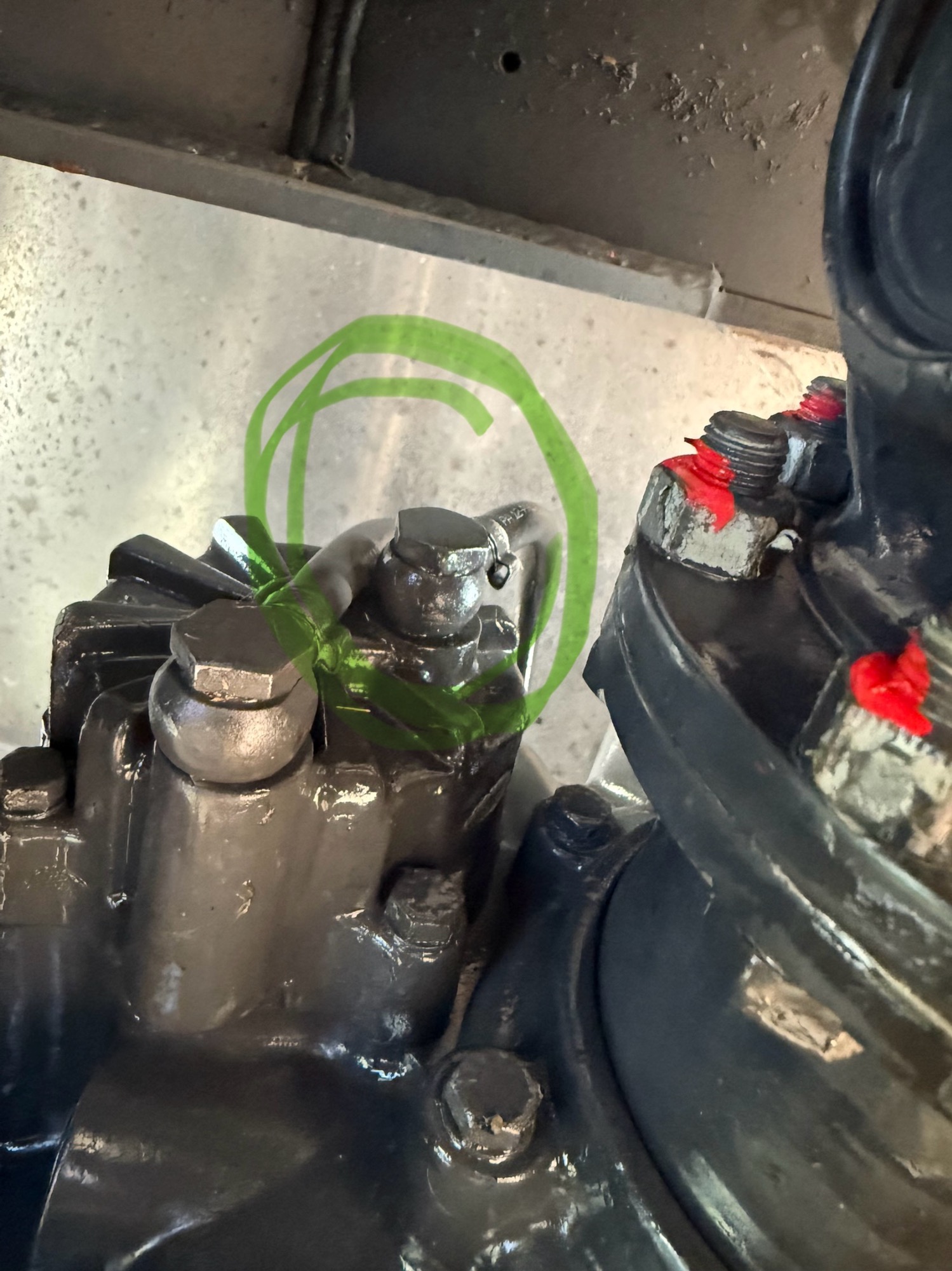 Ein weiteres sanftes Festziehen (38 Nm) der Hohlschraube hatte leider nichts gebracht. Offensichtlich ist die Luft am Schlauchanschluss entwichen. Habe mich nicht getraut den Schlauch selbst zu entfernen. War am nächsten Tag in der MAN Werkstatt in Vannes/Bretagne, wo mir gleich geholfen wurde. Der Mechaniker schraubte den Druckschlauch ab und entfernte mit viel Aufwand die 2-Ohrschelle. Der Mechaniker konnte mit dieser Befestigungsart gar nichts anfangen. Auch Klaus meinte, dass an dieser Stelle eine solche Befestigung grundsätzlich nicht vorgesehen sei. Interessanterweise wurde der Schlauch jedoch so bei ZF München befestigt.