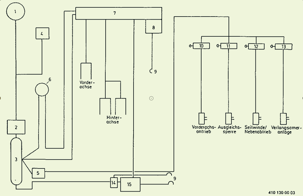 Das Vierkreisschutzventil gibt es in diesen Baureihen sehr selten. Das nannte sich zu der Zeit Drucksicherungsventil. Alles was nicht Bremse war, befand sich hinter dem Drucksicherungsventil, bei den Fahrzeugen war das der Allradantrieb, die Differentialsperre/Ausgleichssperre, die Seilwinde/Nebenabtrieb und die Verlangsameranlage/Staudruckbremse