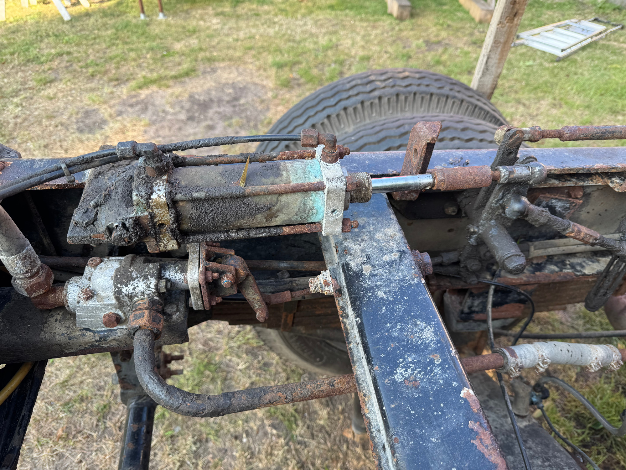 Ich habe den hinteren Zylinder ursprünglich für eine zus. Betätigung der Bremse gehalten, da darunter noch ein Ventil von Wabco verbaut ist.