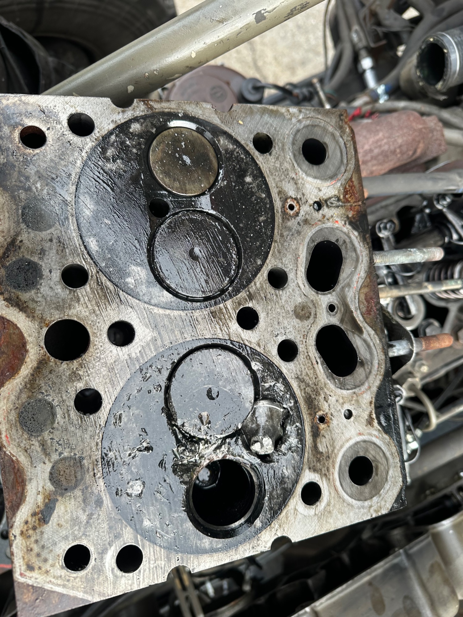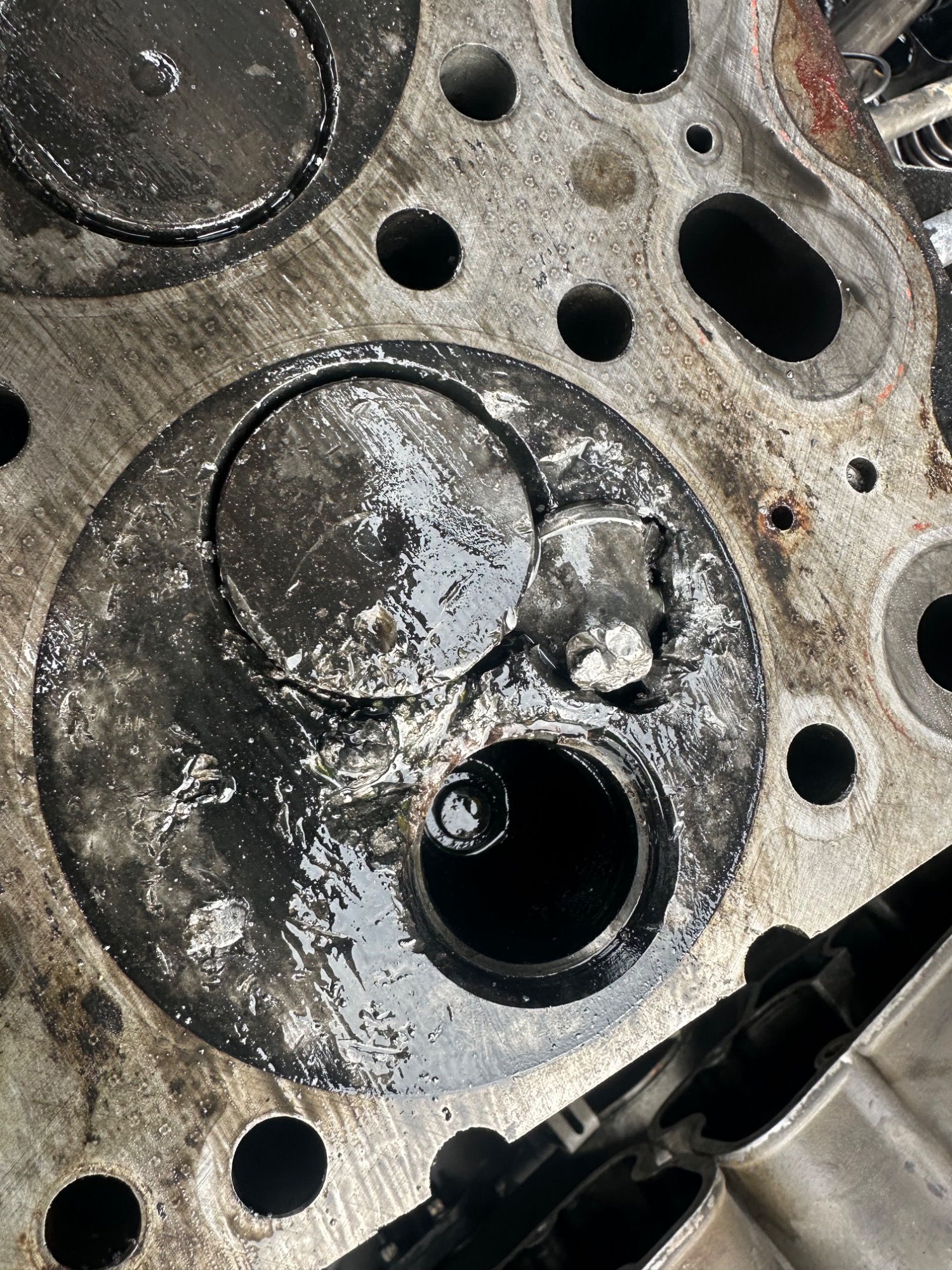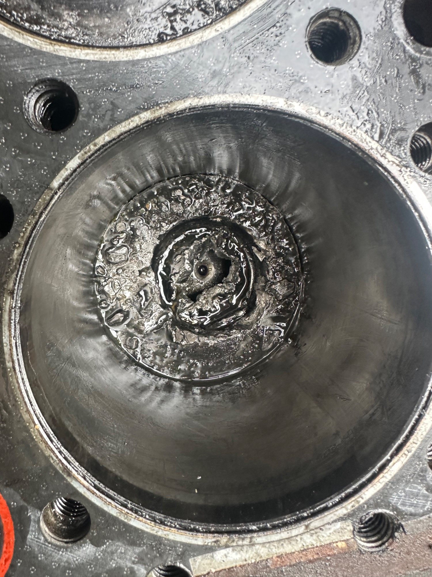 Ein Ventil des hinteren Zylinders ist abgerissen, hat den Kolben zerschlagen und steckt nun im Kopf. Die Büchse des hinteren Zylinders ist auch gerissen.
