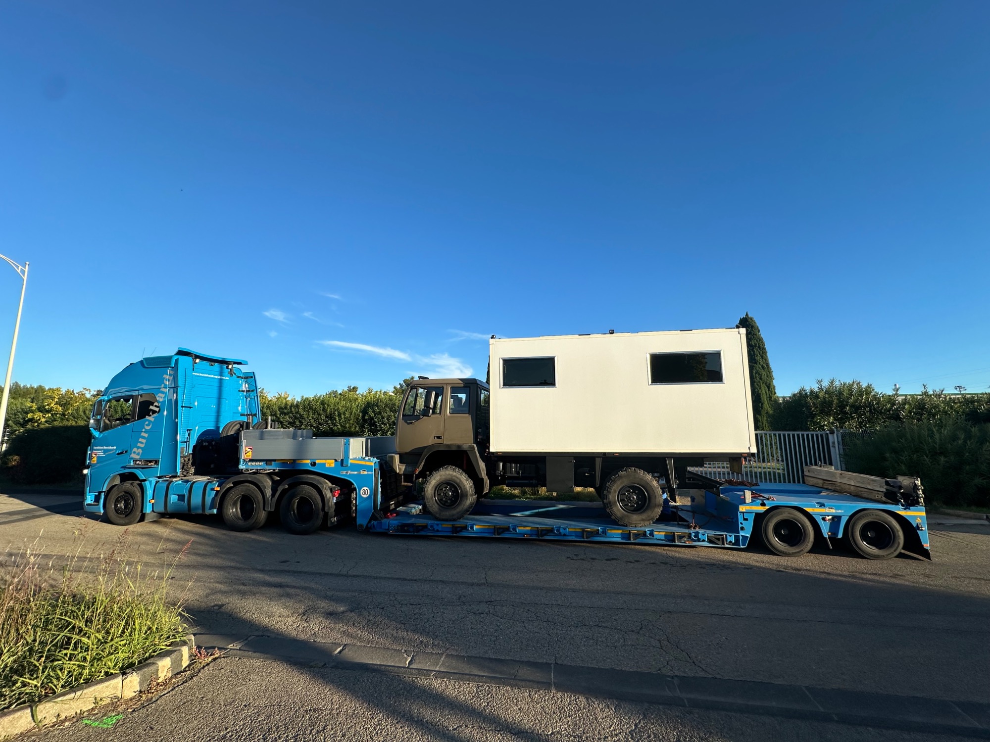 Gestern meldete sich der Fahrer des Tiefladers, dass er in zwei Stunden bei uns sei. Wir machten uns also Geschwind zurück auf den Weg zu unserem dicken.
